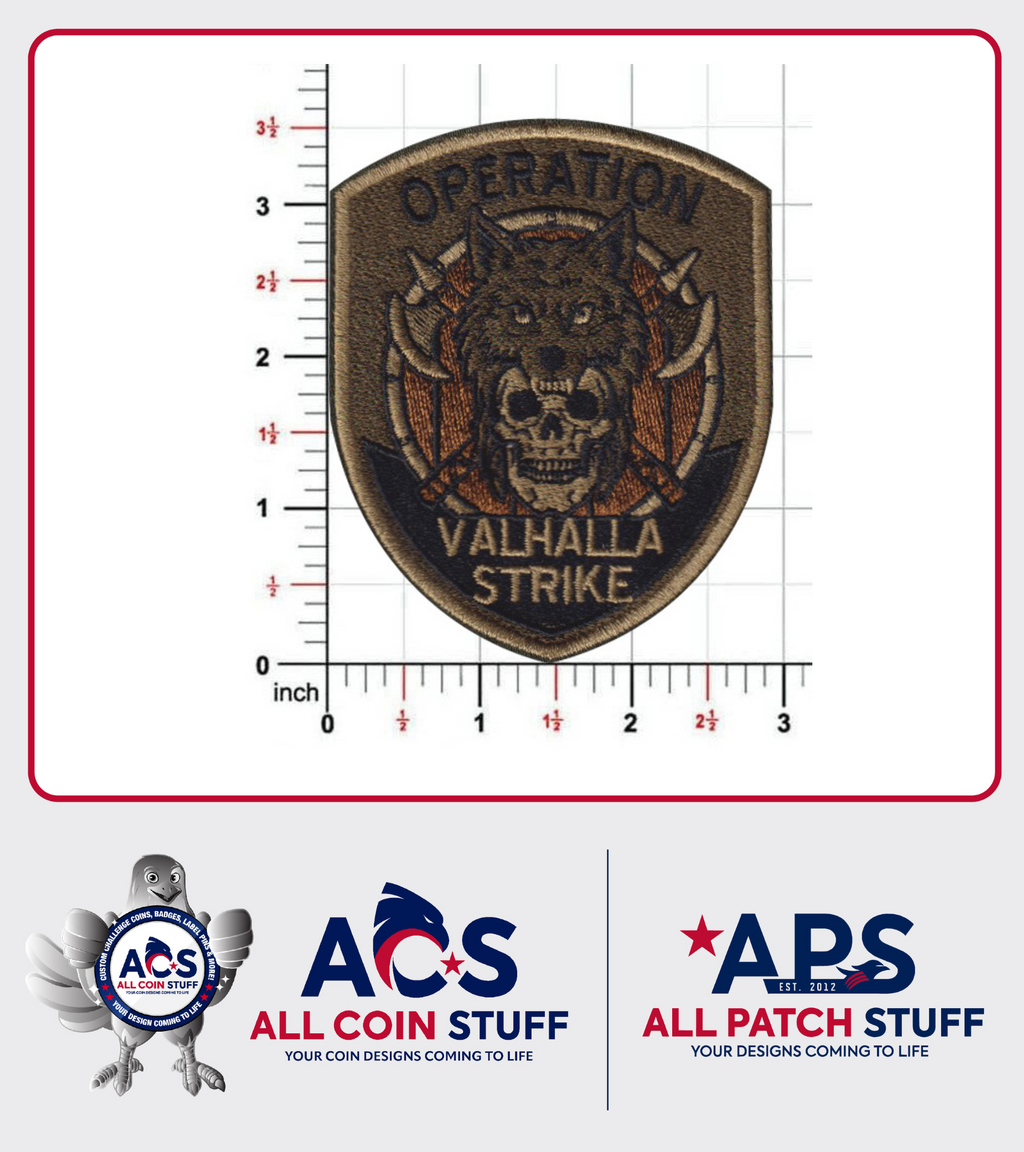 Custom Patches; 3.5 inch Valhalla Strike Embroidered Patches with velcro.