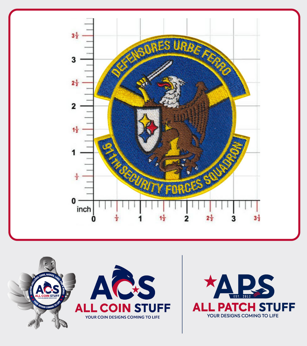 Custom Patches; 3.5 inch 911th Security Forces Squadron - Colored Embroidered patches with velcro backing.